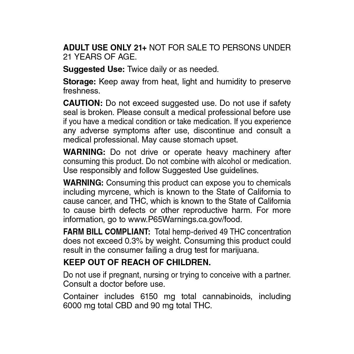 WARNING: Consuming this product can expose you to chemicals including THC, which is known to the State of California to cause birth defects or other reproductive harm. For more information go to www.P65Warnings.ca.gov.