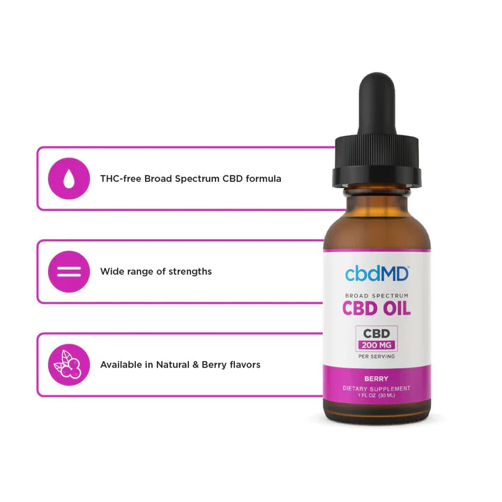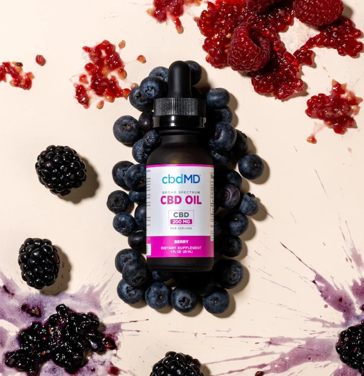 cbdMD CBD Oil Tincture Drops - Broad Spectrum | Natural | 30 ml - 7500 mg - Berry (250 mg per serving) is backordered and will ship in one week.