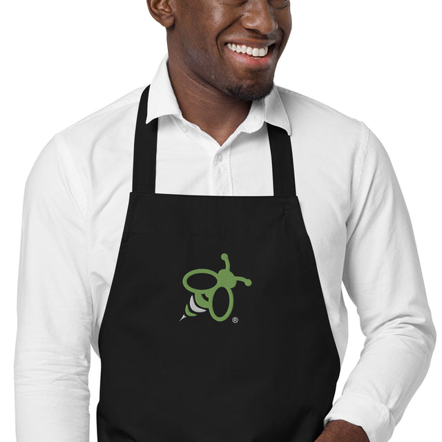 Chef's Apron - Organic Cotton with Embroidered Green Bee Logo - Black is backordered and will ship in one week.